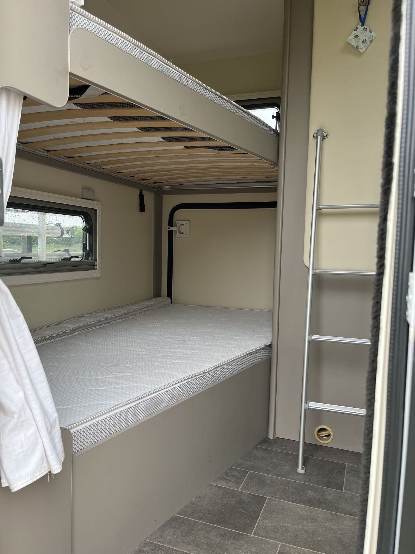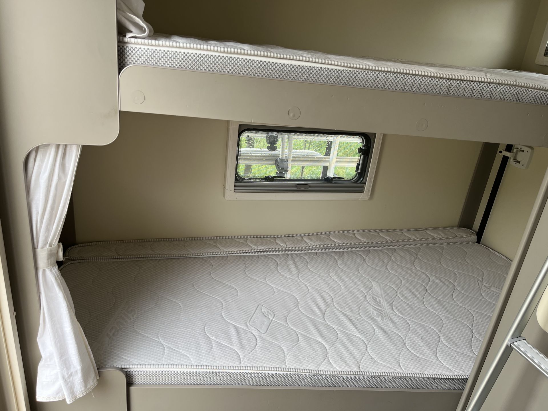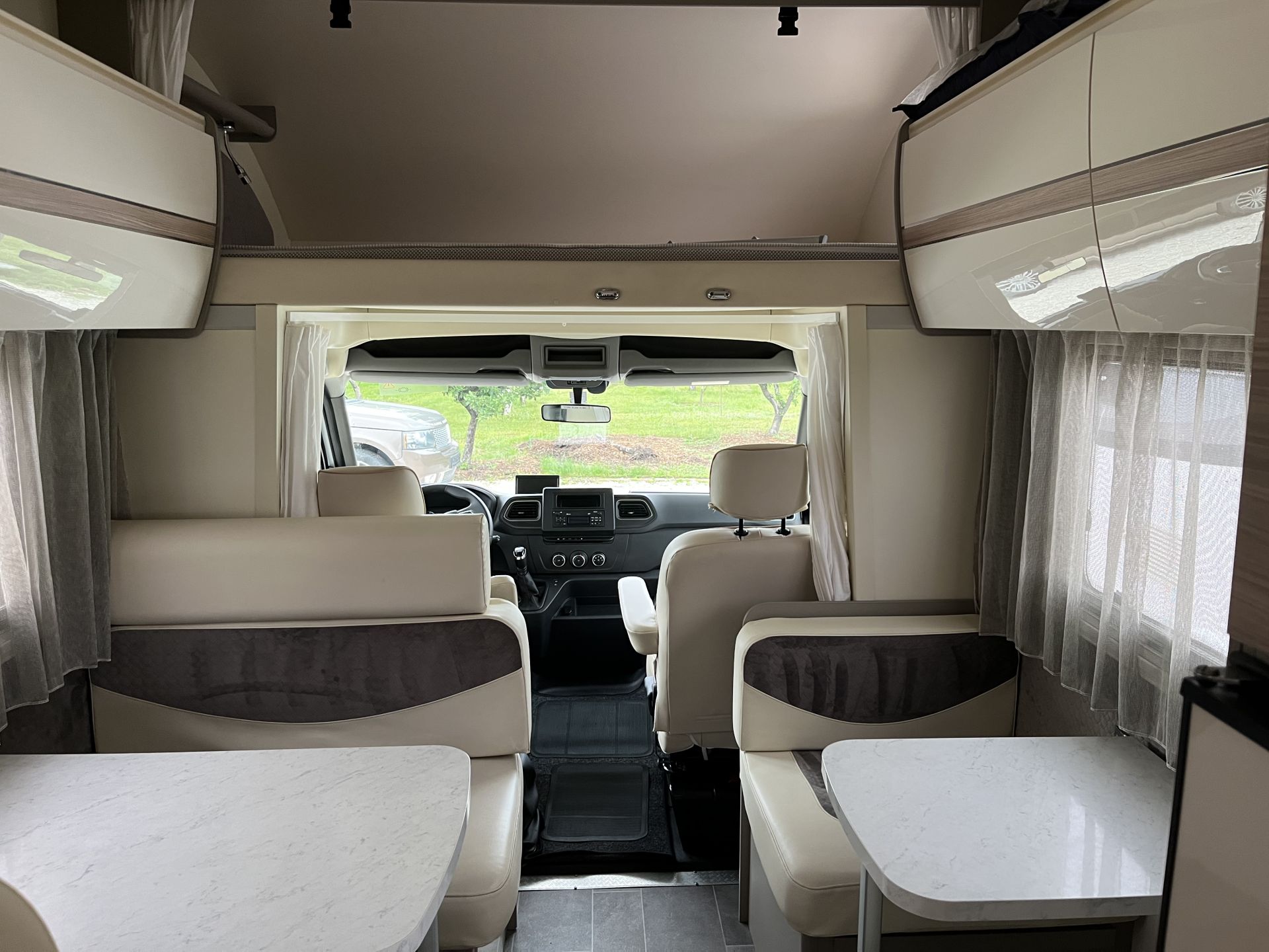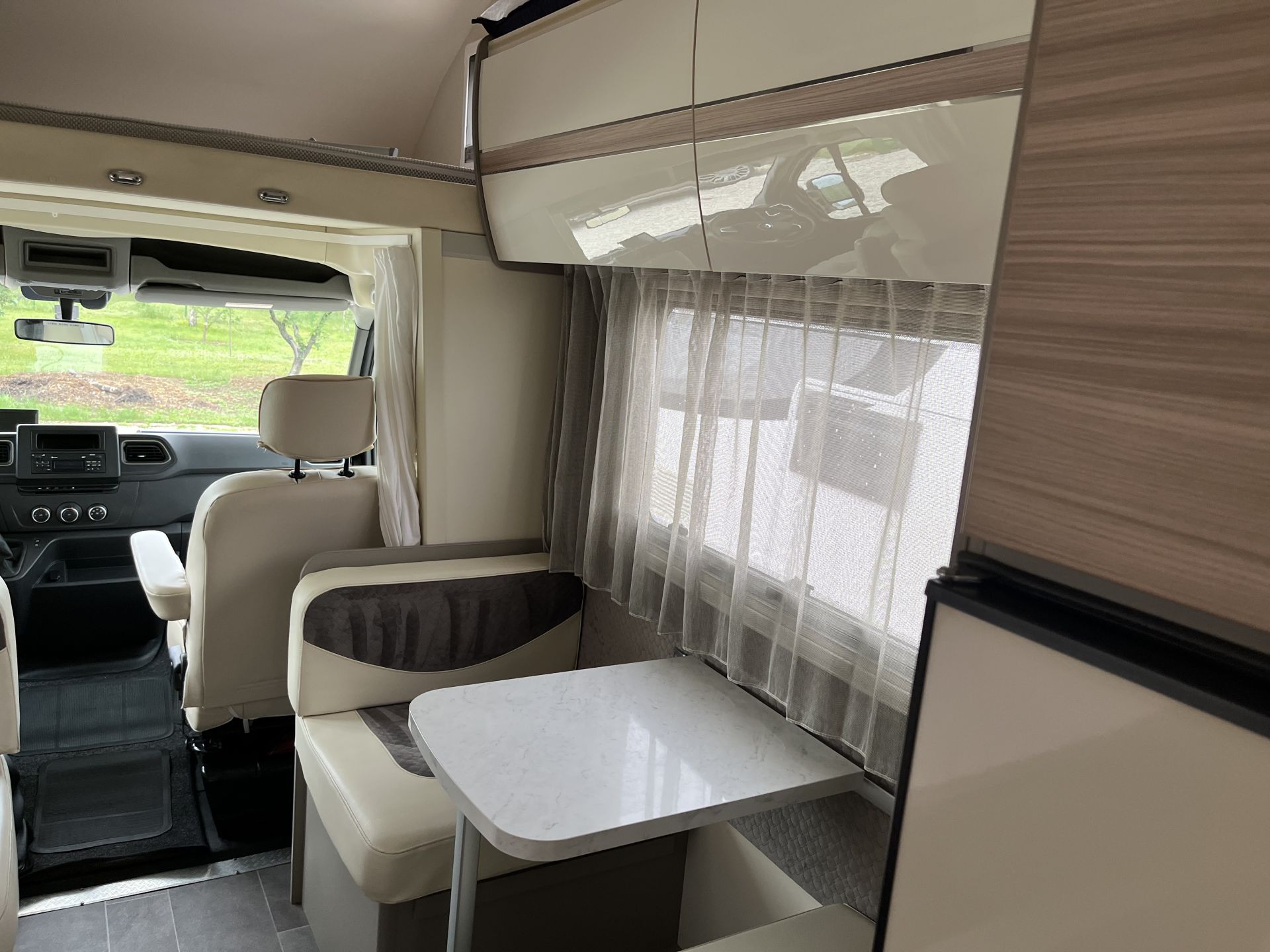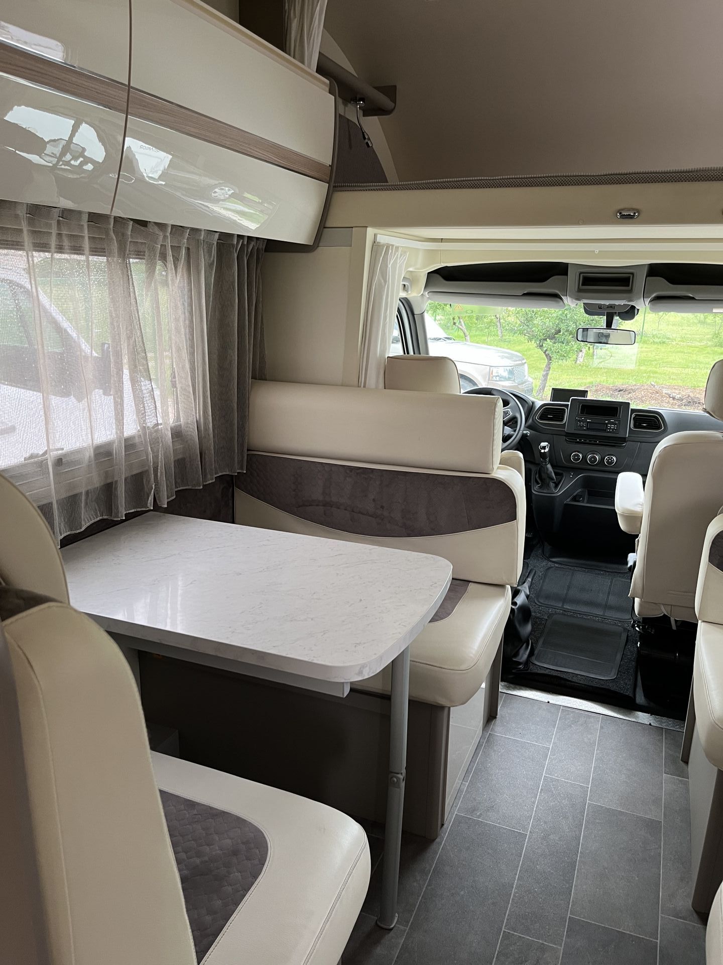 Belső: egy franciágy - alkóv, emeletes ágy, ággyá alakítható étkező, nagy hűtőszekrény + fagyasztó, gázos főzőlap, wc + zuhanyzó, gáz állófűtés, álló motorklíma, konyha 6 személyre felszerelve, állóklíma