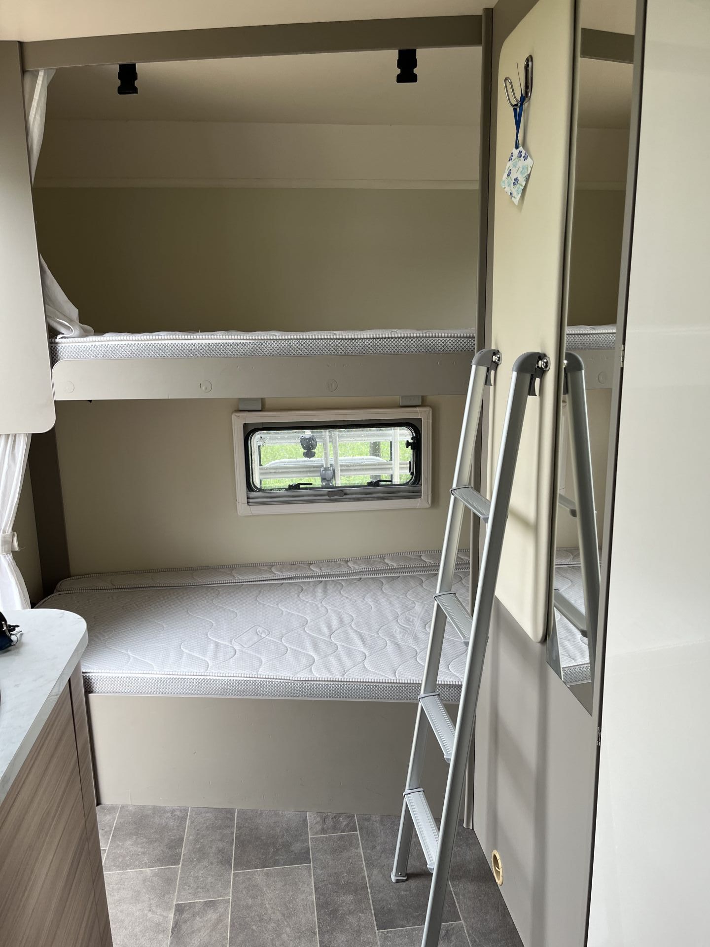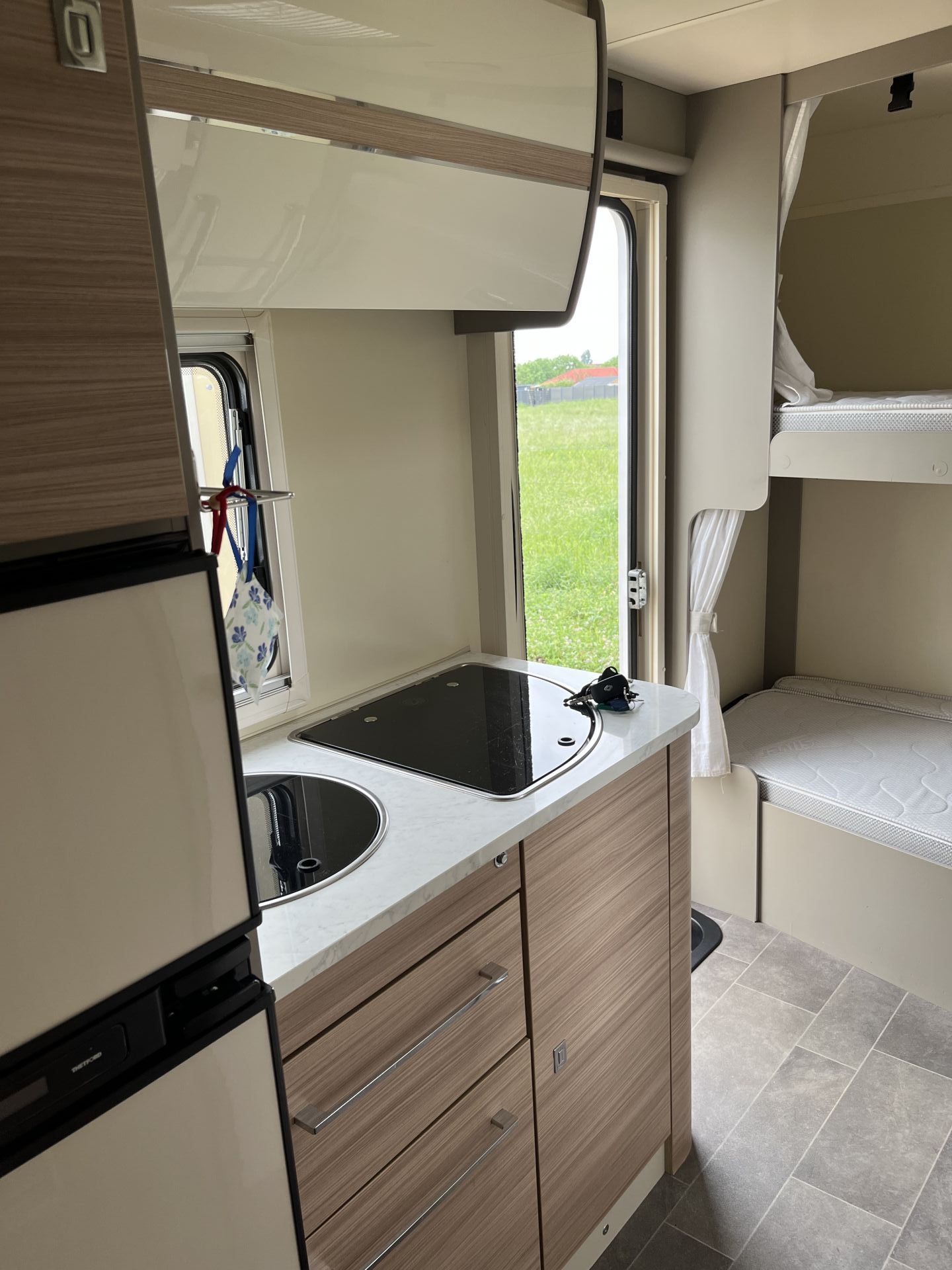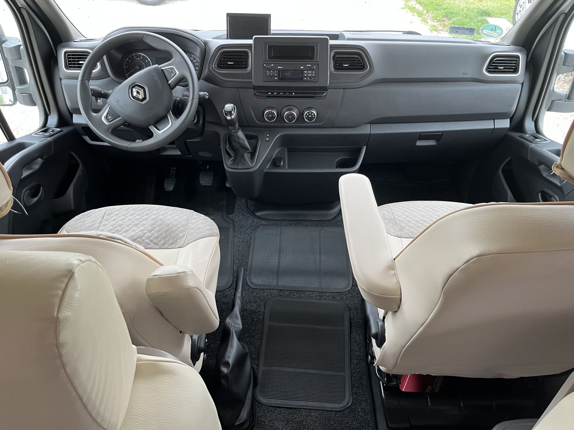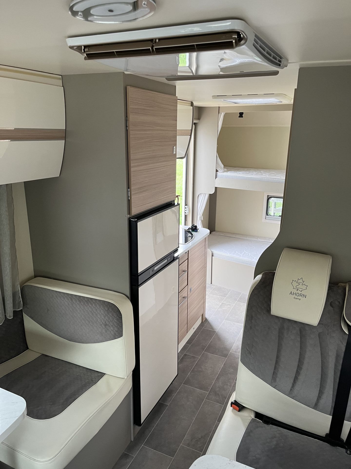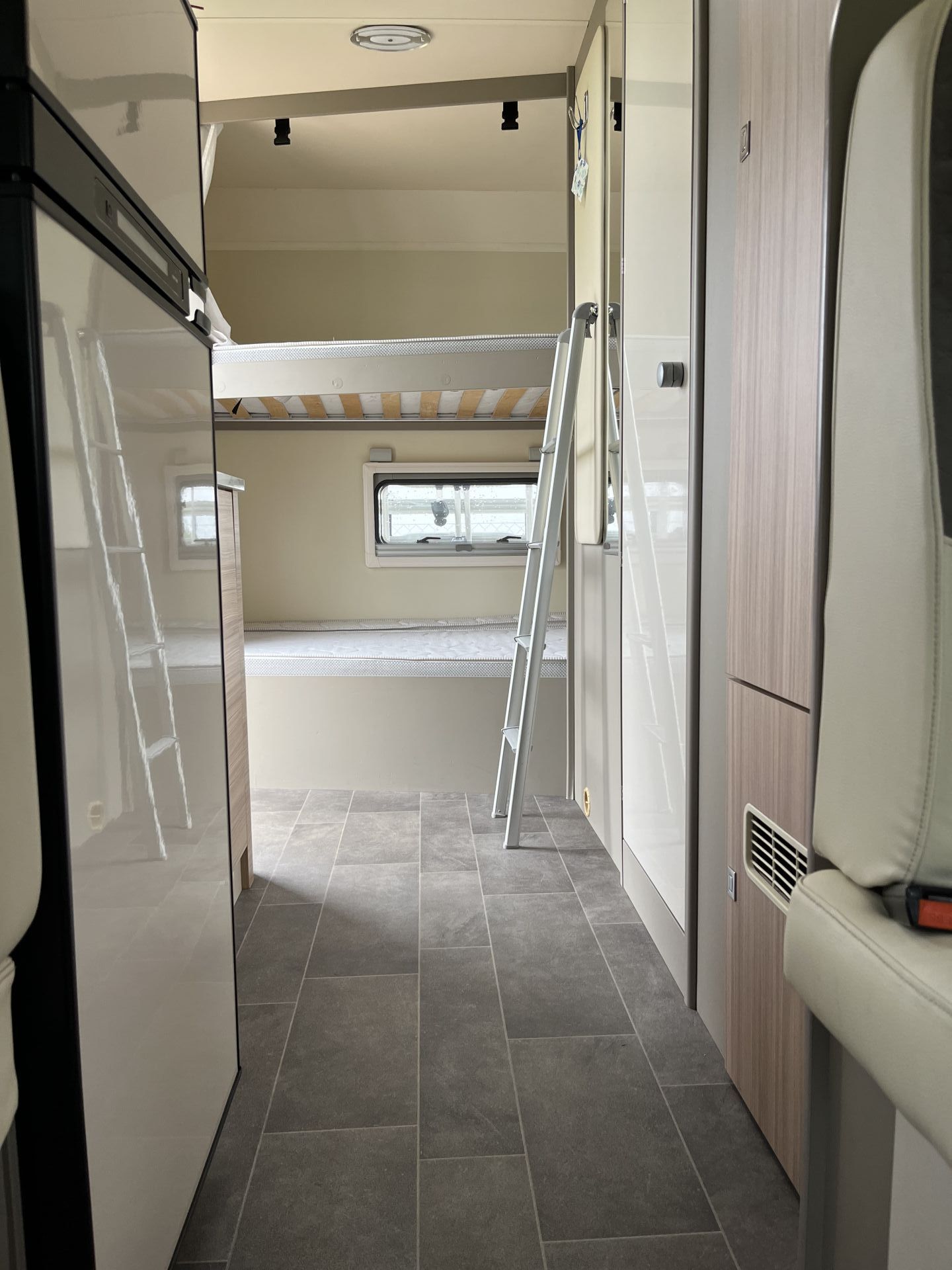 Belső: egy franciágy - alkóv, emeletes ágy, ággyá alakítható étkező, nagy hűtőszekrény + fagyasztó, gázos főzőlap, wc + zuhanyzó, gáz állófűtés, álló motorklíma, konyha 6 személyre felszerelve, állóklíma